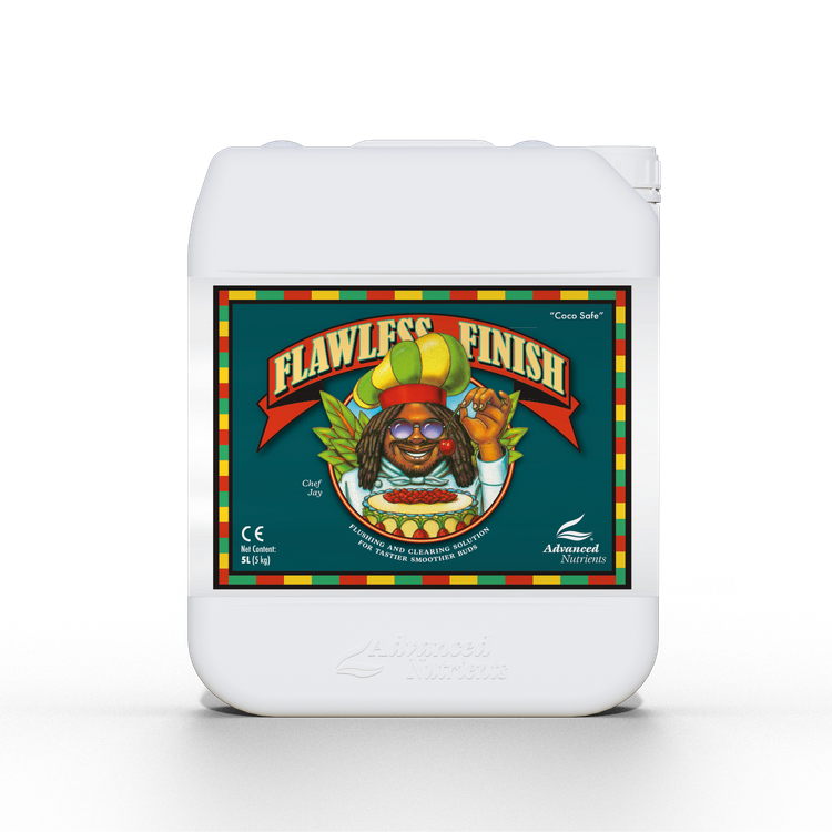 Advanced Nutrients Flawless Finish - Advanced Nutrients' Flawless Finish plant support product is scientifically designed to help flush accumulated nutrients from flowers and foliage. In various crops where flavor and texture are important, it removes chemical residues, resulting in a better taste. It also gives growers control over the final appearance. The process plants use to grow—absorbing chemicals from nutrients, water, and the atmosphere—causes them to accumulate excessive amounts of salts and other potent chemicals. Failure to remove these excesses before harvest will compromise the final quality of your produce. Instead of flushing with plain water, which strips plants of nutrients and limits flower and resin development, use Flawless Finish. It uses empty chelates—which act like tiny but powerful vacuum cleaners—to remove excess chemical residues from the growing medium, roots, and other plant tissues, including fruit and flowers. The end result is a perfectly grown crop of plants that will be free of at least 85% of the materials accumulated in them before rinsing. That's right – you'll get the cleanest, best possible yield. Apply Flawless Finish right before your next harvest and see results – risk-free thanks to our Grower Guarantee. Directions: Do not add any other additives to the nutrient solution. Use only with water 7-10 days before harvest. Soil: Use with properly balanced pH water. Finishing cycle: Drain and rinse the reservoir of all nutrient solutions. Fill with clean water and add 2.5 ml per liter (1/2 teaspoon per liter) of water. Shake well. The pH should be adjusted between 5.5-5.8 for hydroponics and 6.2-6.5 for soil. Gallery video of AdvancedNutrients products.