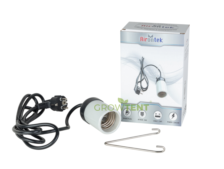 E40 socket with holder and 2m cable for CFL bulbs. The E40 socket is equipped with a hanging hook. The socket already has a power cord and plug connected. Cable length: 2m. Brand: Airontek
