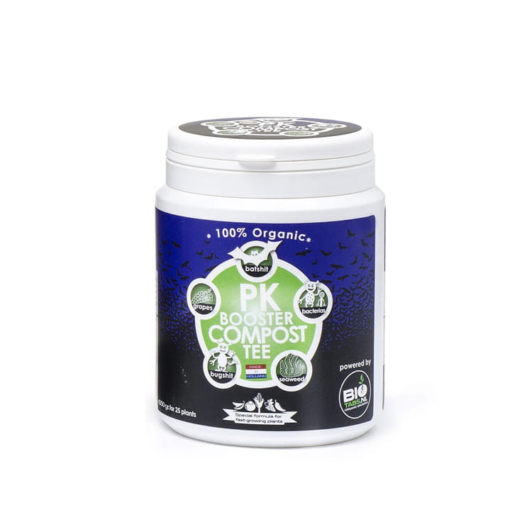 BioTabs PK Booster Compost Tee – a flowering stimulator, booster, and fertilizer. PK Booster Compost Tee is the latest product from BioTabs. It contains a highly concentrated blend of compost, batguano, seaweed, bacterial cultures, and other special ingredients. The bacteria found in PK Booster Compost Tea provide a high dose of phosphorus (P) and potassium (K). This product is a true PK Boost! How to use: Add 5ml of Orgatrex per 1L of chlorine-free water at room temperature. Add 15g (1 tablespoon) of PK Booster Compost Tee per 1L of water. Leave the mixture to aerate for 24-36 hours (use an aquarium pump or air stone). Use the "tea" within 4 hours of finishing aerating. Water each plant with 500ml of the solution. For better results, add 5g of Mycotrex per 5L of water (before aerating). This product contains living organisms and may contain mold. THIS DOES NOT AFFECT THE QUALITY OF THE PRODUCT! Important: Keep out of reach of children. Not suitable for human consumption. Store in a cool, dry place. Gallery
