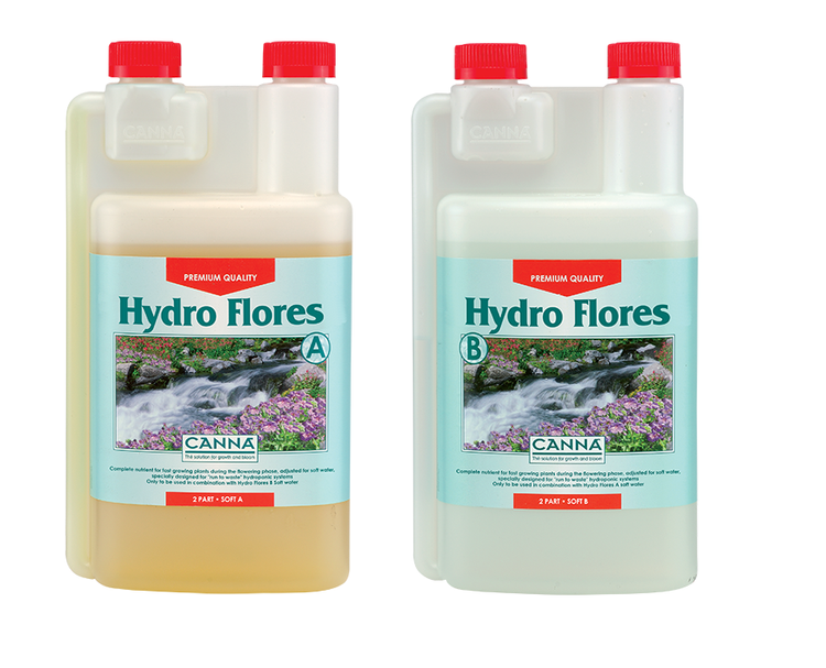 CANNA Hydro Flores is a comprehensive professional nutrient for fast-growing plants, containing the essential nutrients for optimal flowering. HYDRO Flores is easy to use, dissolves directly, and is best suited for cultivation with an automatic "run-to-waste" irrigation system. Advantages of CANNA Hydro Flores: Hydro Flores is directly available to the plant and consists of the right nutrient composition, which is crucial during the flowering phase. During the flowering phase, for example, significantly less nitrogen is required, but more potassium and phosphorus. HYDRO Flores is also rich in trace element chelates in a directly absorbable form. This leads to lush flowering Dosage 400 ml A and 400 ml B per 100 l of water, 1:250 Instructions Before use, please shake the bottle well Please fill the fertilizer tank with water Please add HYDRO Flores Hard (hard) in a solution concentration of 1:250 (400 ml A and 400 ml B per 100 l of water) Please add HYDRO Flores A Hard to the fertilizer tank Please mix well and add HYDRO Flores B Please mix well again and leave to stand for a few hours EC HYDRO Flores Hard dissolved in tap water ranges between 1.8 – 2.7 mS (= EC of the solution + EC of the water) Recommended pH: 5.2 - 6.2 In case of intensive cultivation, please additionally add fertilizer to the plant by dripping 1 – 3 times a day and make sure that the drainage is between 10% and 20% and/or flush with water every 1-2 weeks. Generally, this means 4-6 liters of fertilizer per m² per day. Storage, health, safety and other instructions: CANNA has developed HYDRO Flores specifically for the plant's flowering phase. Please do not mix concentrates A and B directly; insoluble compounds may occur that may not be absorbed by the plant. Please store the container tightly closed in a cool, dry place (ultraviolet rays cause the iron chelates in the nutrient to break down). Please keep out of the reach of children.