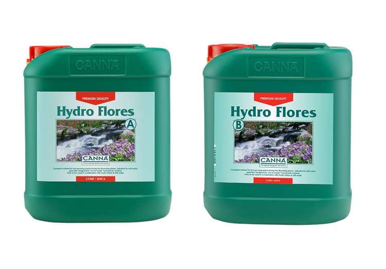 CANNA Hydro Flores is a comprehensive professional nutrient for fast-growing plants, containing the essential nutrients for optimal flowering. HYDRO Flores is easy to use, dissolves directly, and is best suited for cultivation with an automatic "run-to-waste" irrigation system. Advantages of CANNA Hydro Flores: Hydro Flores is directly available to the plant and consists of the right nutrient composition, which is crucial during the flowering phase. During the flowering phase, for example, significantly less nitrogen is required, but more potassium and phosphorus are needed. HYDRO Flores is also rich in trace element chelates in a directly absorbable form. This leads to lush flowering Dosage 400 ml A and 400 ml B per 100 l of water, 1:250 Instructions Before use, please shake the bottle well Please fill the fertilizer tank with water Please add HYDRO Flores Hard (hard) in a solution concentration of 1:250 (400 ml A and 400 ml B per 100 l of water) Please add HYDRO Flores A Hard to the fertilizer tank Please mix well and add HYDRO Flores B Please mix well again and leave to stand for a few hours EC HYDRO Flores Hard dissolved in tap water ranges between 1.8 – 2.7 mS (= EC of the solution + EC of the water) Recommended pH: 5.2 - 6.2 In case of intensive cultivation, please additionally add fertilizer to the plant by dripping 1 – 3 times a day and make sure that the drainage is between 10% and 20% and/or flush with water every 1-2 weeks. Generally, this means 4-6 liters of fertilizer per m² per day. Storage, health, safety and other instructions: CANNA has developed HYDRO Flores specifically for the plant's flowering phase. Please do not mix concentrates A and B directly; insoluble compounds may occur that may not be absorbed by the plant. Please store the container tightly closed in a cool, dry place (ultraviolet rays cause the iron chelates in the nutrient to break down). Please keep out of the reach of children.