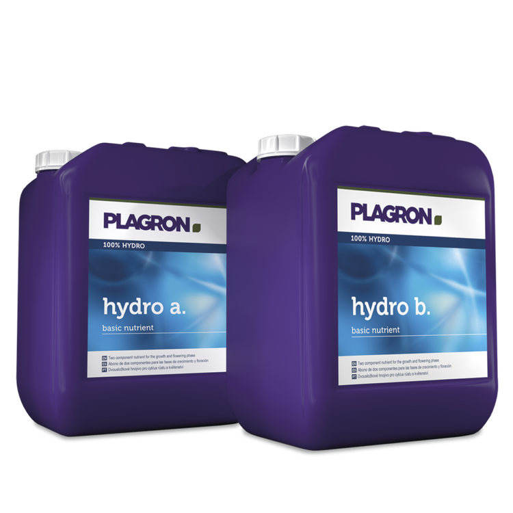 Plagron Hydro A&B - Fertilizer for Hydroponics Plagron Hydro A&B is a highly concentrated biomineral base fertilizer used during the plant's growth and flowering phases. This unique liquid formulation contains numerous trace elements in a high-quality chelated form (DTPA). This allows the plant to thrive even when the pH is less than ideal or the substrate temperature is too low. This fertilizer can be used in all types of neutral substrates. Hydro A is rich in calcium, which helps the plant combat heat stress. Hydro B contains magnesium, which increases chlorophyll production, making it an essential building block for plant growth. Hydro A&B complement each other, creating a complete nutrient combination. Hydro A&B can be used in all types of neutral substrates. Hydro A&B can be stored for four days after mixing with water. Monitor the pH, as it will likely begin to rise slowly. Make sure no organic products have been added to the solution, as they can begin to spoil after just 48 hours. Also, ensure the solution is in motion (circulation pump) and that the tank is clean before mixing the solution. Application: Shake the container well before use. Transport upright and store in a dark place. Storage temperature: 10-35°C. Directions: Shake well before use. Add a maximum of 2.5 ml of Hydro A per 1 liter of water (1:400). Every time you use Hydro A, use the same amount of Hydro B. This solution should be used every time you water your plants. Full Control over pH & EC Values When growing hydroponically, you have full control over the EC and pH values. You are responsible for the pH value and determine the EC (nutrient) value. Thanks to the well-thought-out nutrient composition of Hydro A & B, you can very precisely meet the requirements of your plants. Characteristics of Hydro ANPK (3-0-1) Approx. 4.2%MgO 0.4% Hydro BNPK (1-3-6)MgO 1.4% Dosage PLAGRON HYDRO A&B Thanks to the 1:400 mixing ratio, Hydro A & B is more concentrated than similar products from other brands. This makes it more economical to use. 1 liter of Hydro A & B produces up to 400 liters of nutrient water. DOSAGE: Add 2.5 ml of Hydro A (1:400) per liter of water. For each dose of Hydro A, use the same amount of Hydro B. Apply this solution with each watering.