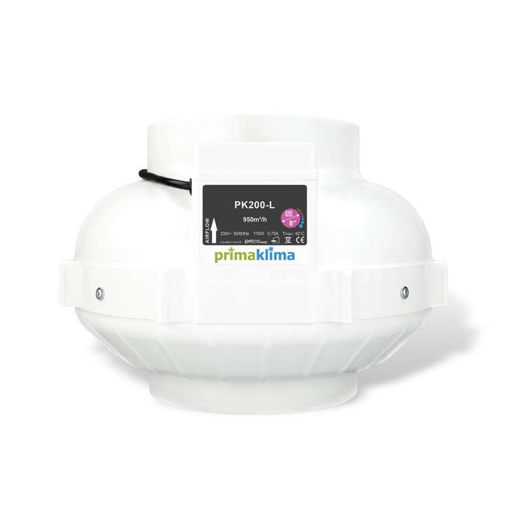 200mm fan 950m3/h suitable for continuous operation. Specifications: The Primaklima PK200-L is a high-performance in-line fan equipped with an ebm-papst AC motor with backward-curved blades, which is optimally matched to the housing. The entire housing is made of high-impact, fire-resistant polyamide (nylon). Maintenance-free, long-life ball bearings contribute to particularly smooth motor operation. Features: ebm-papst AC motor Impeller with backward-curved blades Low energy consumption Low noise emissions Aerodynamically optimized shape Impact-resistant and durable housing Connection and control system in the housing Technical specifications: Connection: 200 mm Max. Air flow: 950 m³/h Power: 170 W Input: 230 V, 50/60 Hz, 0.75 AT max: 50°C Dimensions: 340 x 248 mm (W x H) Weight: 3.8 kg