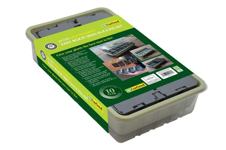 Garland 24-Cell Self-Watering Root Success Kit. Made in the UK. The Garland 24-Cell Self-Watering Fast Root Success Kit is a comprehensive solution for seed germination and seedling production, designed for rapid root development and ease of use. Thanks to its innovative watering system and special cell design, the kit provides optimal conditions for young plants to grow. Product Features: Complete kit: Includes a base tray with a water reservoir, a capillary mat with a platform, 24 seedling cells, and a transparent cover with adjustable ventilation. Self-Watering System: The capillary mat continuously delivers water to the cells, eliminating the need for frequent watering. Split Cells: Allow for easy root growth monitoring and hassle-free transplanting without damaging the root system. Proper Aeration: Each cell has a central drainage hole and side ventilation slots, promoting the development of healthy, strong roots. Durable and eco-friendly: made of 100% recycled plastic, it is damage-resistant and dishwasher-safe; covered by a 10-year manufacturer's warranty. Compact size: the set measures 37.5cm (L) x 23cm (W) x 14cm (H), perfect for placing on a windowsill. This set is perfect for both home growing and professional nurseries, ensuring a healthy start for your plants with minimal effort. Dimensions: 37.5cm (L) x 23cm (W) x 14cm (H)