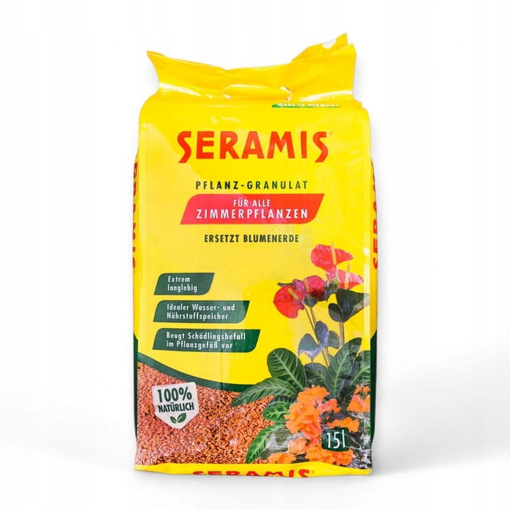 Seramis 15L Potted Plant Soil. Seramis specialized potting soil for houseplants consists of lightweight and porous granules made from high-quality, purified clay. It's an excellent replacement for regular potting soil when repotting plants. The granules absorb water and then gradually release it as plants need it. The unique, porous structure stores large amounts of water, like a sponge. Seramis' porous granules ensure even moisture distribution while allowing for good substrate aeration. Roots grow between the granules, absorbing water and nutrients while simultaneously receiving an optimal oxygen supply. This allows Seramis substrate to support strong and healthy plant growth and abundant flowering. The clay granules are very lightweight, do not clump, and do not lose their structure, allowing for optimal air circulation within the substrate. Seramis substrate has many advantages, such as: 100% natural clay granules, requires less watering, easy to water, ensures constant air access to the roots, is allergy-friendly, requires no drainage, and is easy to use. The basic substrate parameters are: raw materials: 100% SERAMIS clay granules, plant-available nutrients: nitrogen (N) – 7 mg/l, phosphorus (P2O5) – 13 mg/l, potassium (K2O) – 120 mg/l, pH (CaCl2): 5.2-6.0, salinity (KCl): <0.5 g/l, package volume: 7.5 dm3 (7.5 liters), intended use: for houseplants regardless of their age and size, manufacturer: SERAMIS GmbH, country of origin: Germany, product condition: new, originally packaged.
