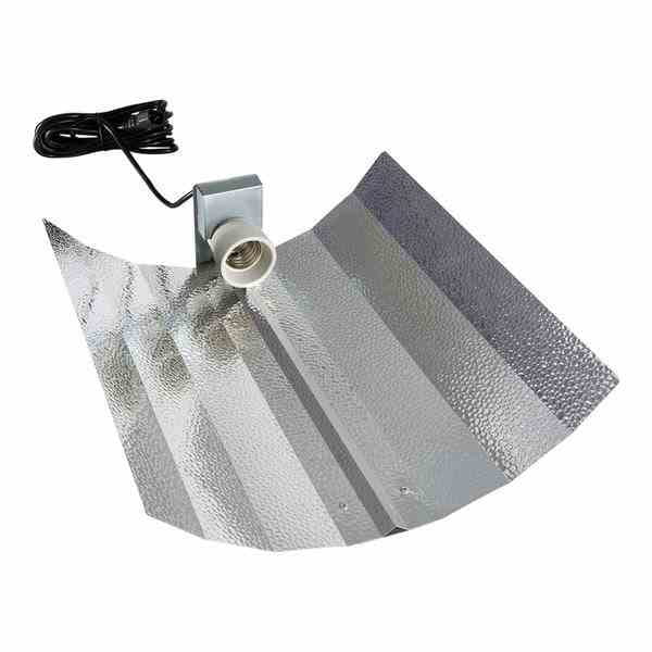 Spectromaster - 50x50cm CFL Reflector with 4m IEC Plug (Male). Basic reflector for 150W, 250W, 400W, and 600W lamps, as well as energy-saving lamps with E40 thread. Size: 50x50cm. Reflectivity: 86%. For indoor plant lighting. Rough-coated version. Pre-installed 4m cable with a male IEC plug. Standard reflector made of perforated aluminum (to prevent "rabbits" from scorching plants), evenly distributes light. Includes: pre-installed E-40 ceramic socket + pre-installed 4m power cable with a male IEC plug. Accessories for mounting the socket, cable, and connecting the bulb to the reflector. No assembly required.